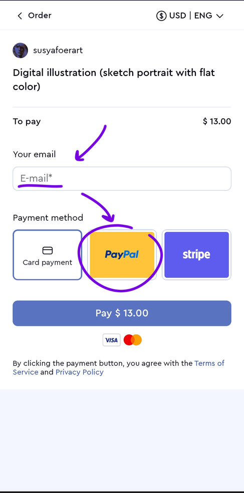 Step 2: after that, a window will appear where you need to enter your email, which will receive the code (for new customers, in the future email will not be needed!). Then choose "PayPal" (or another payment option) and click "Pay"